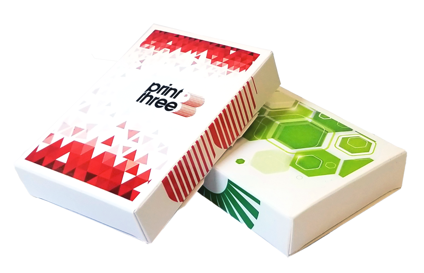 No more 52 Pick Up! Present your cards in style with branded playing card boxes from Print Three. Made of durable cardstock that’s tough enough for even the rowdiest poker nights, these playing card boxes seal the deal on your cards and put the finishing touch on the perfect gift or giveaway. For that added touch, contact your local Print Three for custom playing cards!